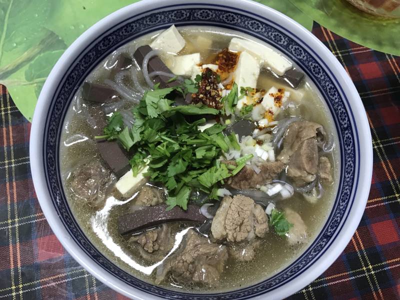 9:把烫好的豆腐、羊血、粉丝、炖好的羊肉码在碗里。