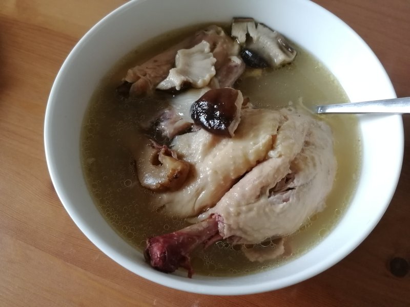 5:鸡汤炖半个小时后,加入菌菇在炖15分钟。(应该是自己家喂的鸡,所以软烂的比较快)