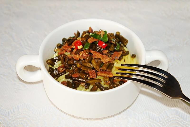 5:提前用培根肉搭配酸豆角打卤,配玉米面条真是太爽了。