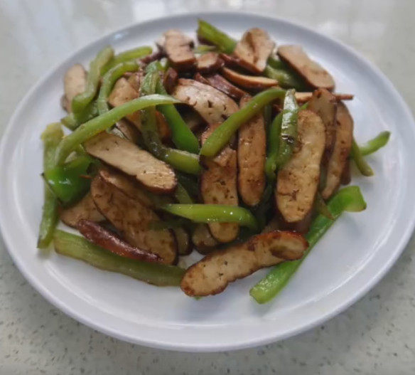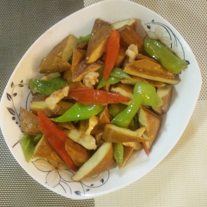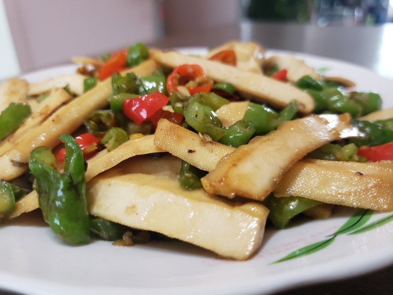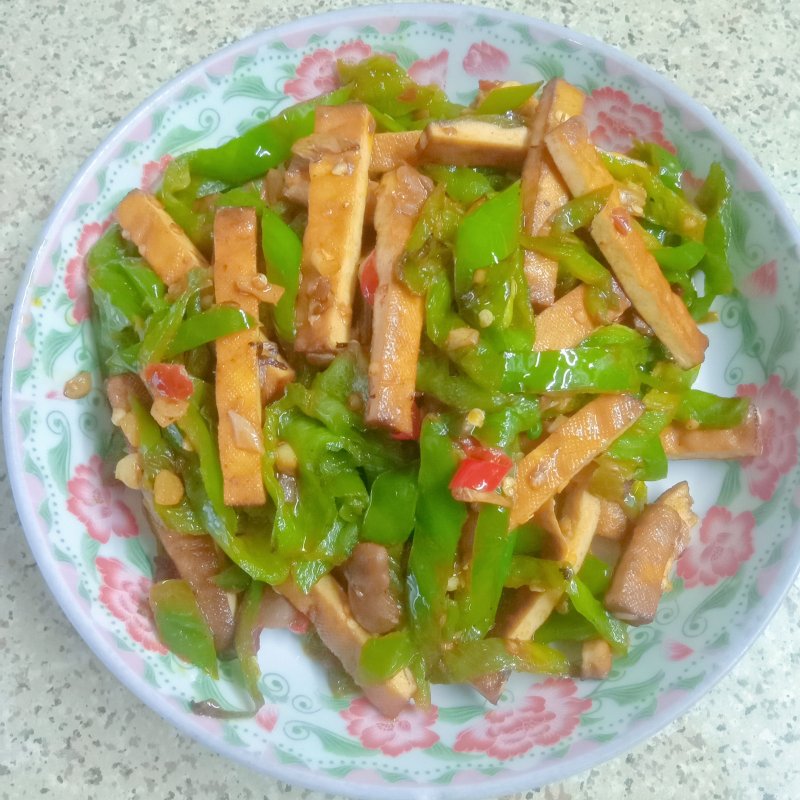 4:锅烧热放少许油,倒入尖椒炒香,再倒入豆干加少许盐和生抽调味,翻炒几下即可。
