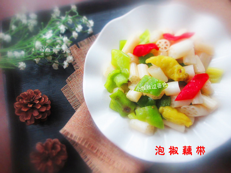 4:拿一个加盖的大碗,放入藕带和彩椒,加入泡椒调味料,液体要没过藕带。放入冰箱过夜,冰镇后更入味好吃