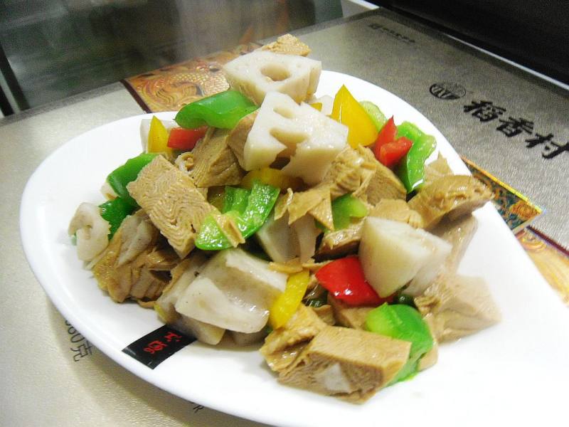 5:倒入莲藕,芸豆,红椒大火翻炒均匀。