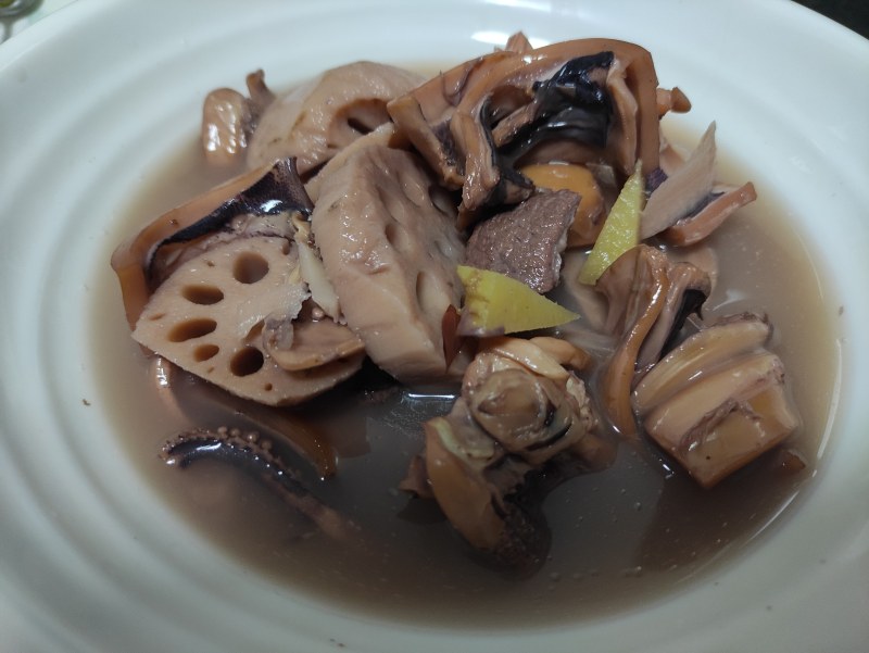 6:大概炖了个把小时;莲藕已经软烂;加入盐,料酒,味极鲜,调味,出锅;