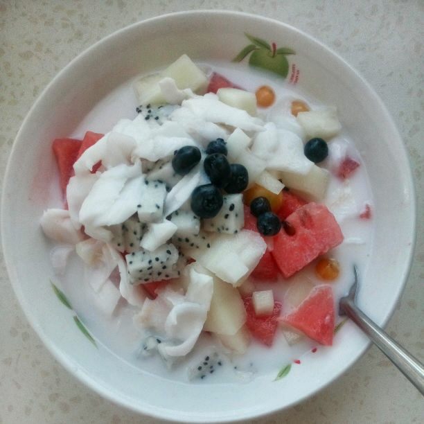 西瓜适量;哈密瓜适量;椰肉适量;椰糕适量;姑鸟适量;蓝莓适量;木瓜适量;蜜豆适量;