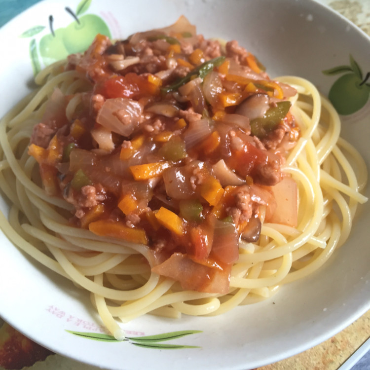 意大利面300克;西红柿2个;洋葱半个;肉末200克;