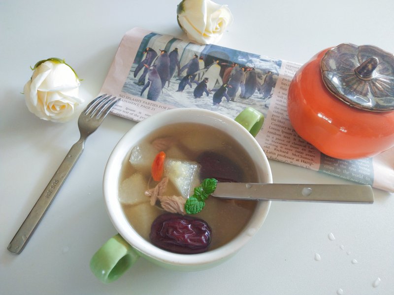 6:一碗润肺清热的菊花雪梨汤做好了.