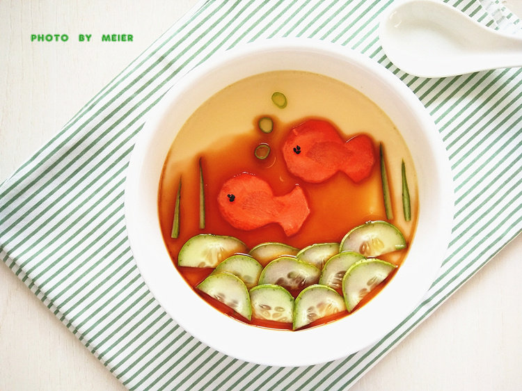 6:关火后3分钟取出鸡蛋羹,淋入生抽及香油。在上面稍做装饰(用胡萝卜剪成小鱼、黄瓜切片摆在下面)。