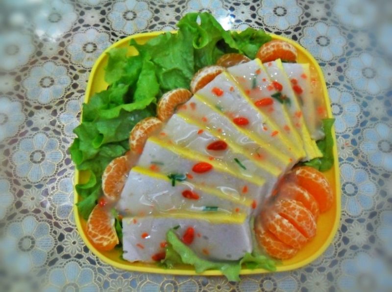 13:把刚刚的蛋黄液倒入锅上,继续蒸3分钟,出锅就完成了鱼糕的制作步骤了~~可以直接吃,做冷拼,汤,或者炒菜