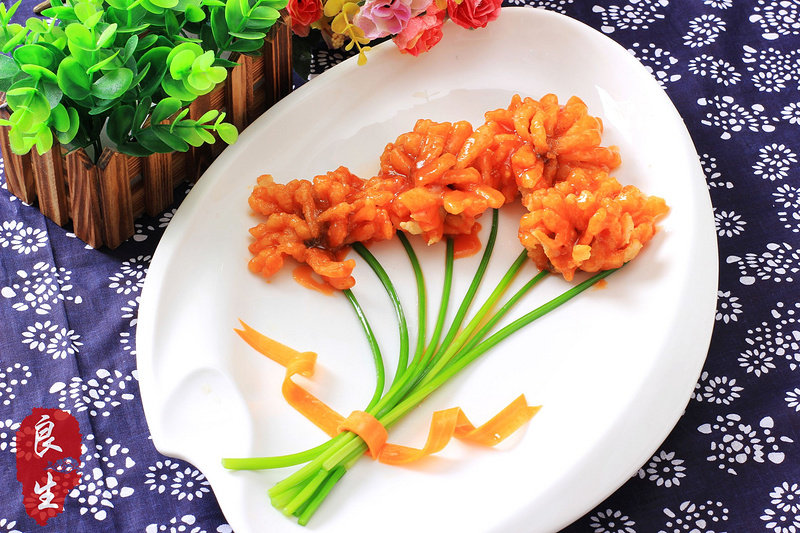 渔歌菊花鱼的美味秘诀在于刀工与火候的精准把控。选用鲜活草鱼,剔骨后以十字花刀细细切割,使鱼肉在炸制后如菊花般绽放。腌制时用姜、葱、料酒去腥提鲜,裹上薄而匀的淀粉锁住汁水。油温七成热时下锅,定型后复炸至金黄酥脆。最后浇上酸甜适口的茄汁或糖醋芡,鱼肉外酥里嫩,形色俱佳,入口鲜香与微酸交织,是一道考验手艺的经典佳肴。