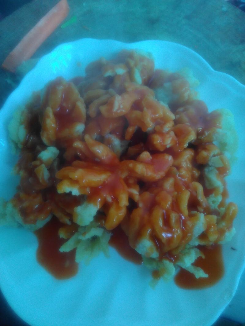 7:把番茄沙司加点水,白糖烧开加点水淀粉勾芡,浇在上面。