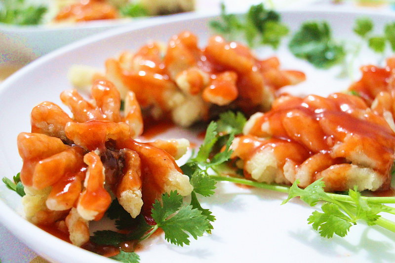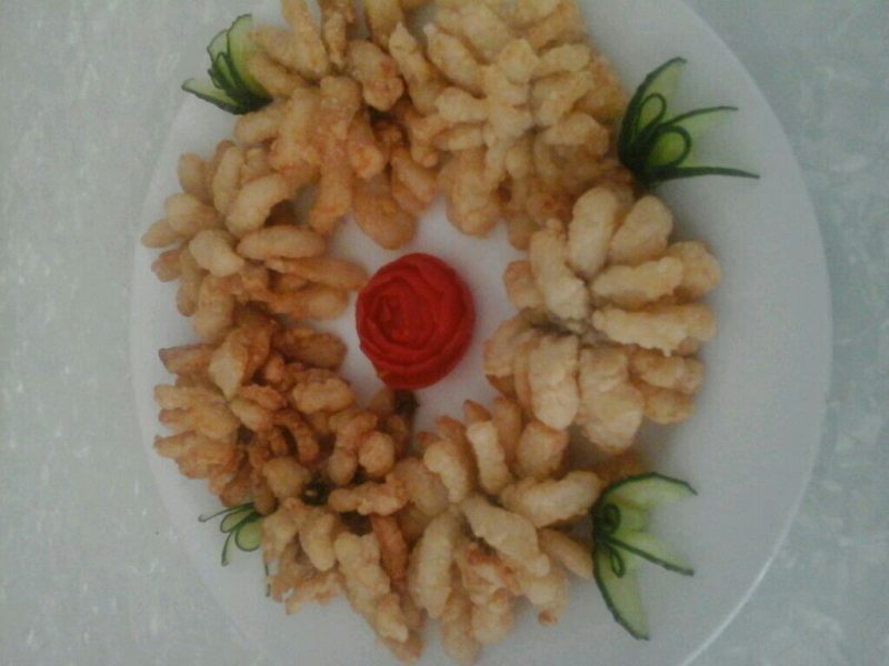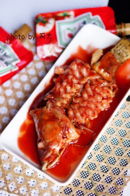 11:把番茄酱淋在菊花鱼上面便ok了,有条件的可来点适量的摆盘。