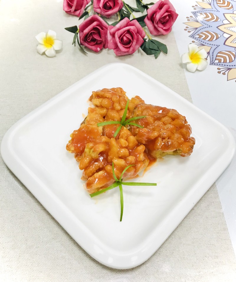 9:番茄酱加少许清水、食盐、淀粉勾芡,粘度刚好可以挂住鱼块即可,不能太稠或太稀。