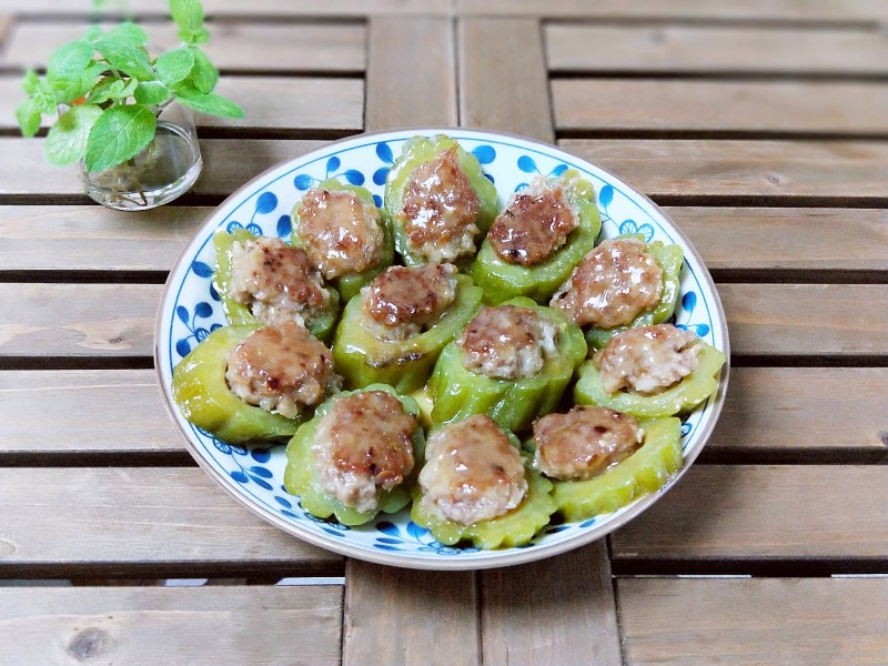 鱼妈片语:1、在挑选苦瓜时,记得要选那些表皮看上去比较青绿有光泽的,同时摸起来光滑,纹理清楚的,就代表是比较新鲜的。2、苦瓜入沸水汆烫是为了去除苦瓜的涩味3、腌制肉糜里加入适量生粉是为了让肉吃起来更嫩滑,腿肉也可以换成是肥瘦相间的三层肉4、蒸苦瓜的原汁如果比较少,可以加入适量的清水来调匀5、此道菜适合趁热吃,冷了苦瓜易变黄
