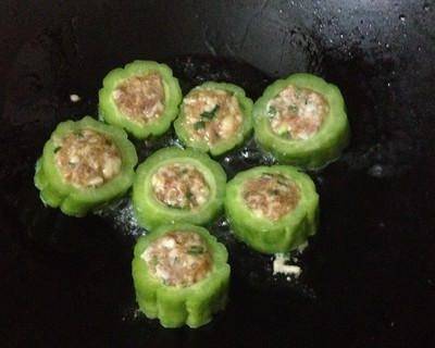 3:将肉馅酿进苦瓜里,并稍煎至两面微赤。
