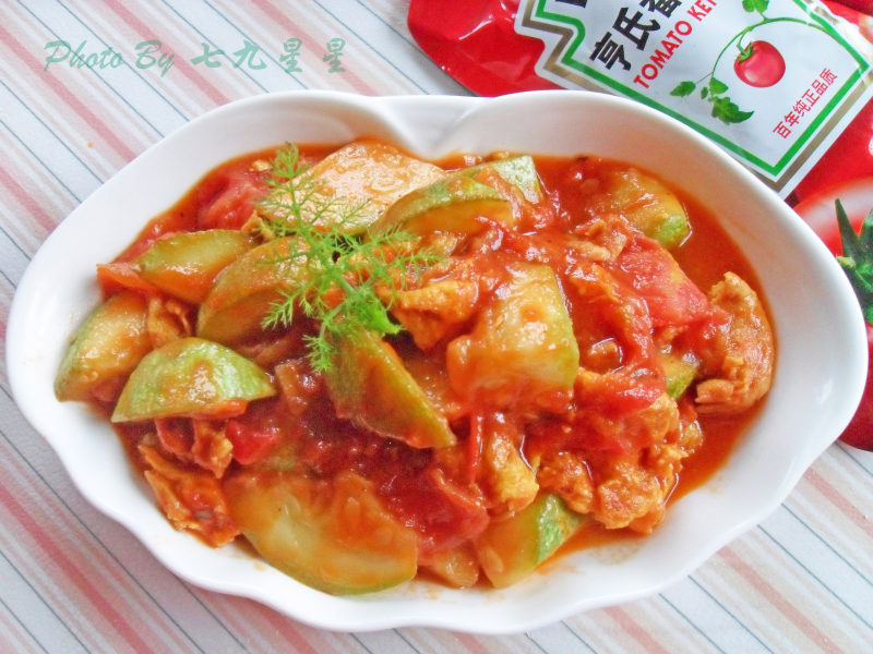 10:此时西葫芦差不多快成熟,加入番茄酱,翻炒。