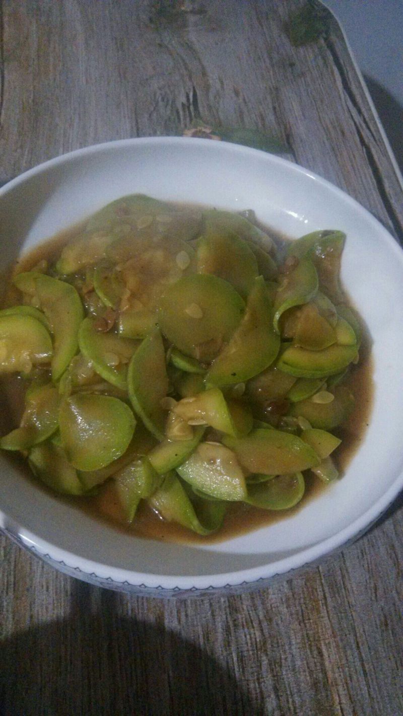 6:下入西葫芦片,大蒜头、米椒翻炒断生。