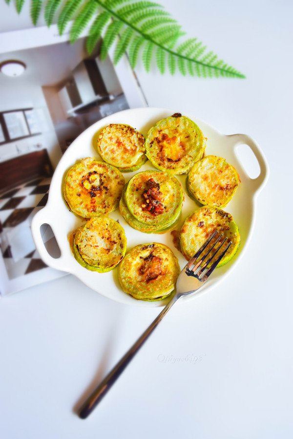 5:平底锅烧热,倒一些油,放上西葫芦片,小火慢慢的煎香。