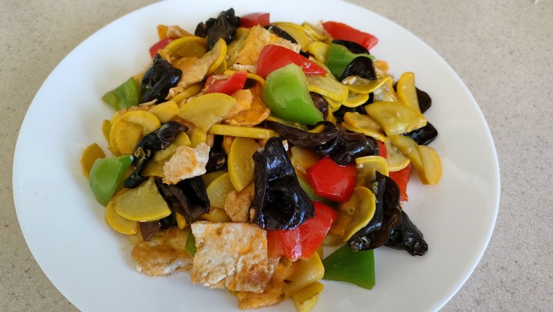 5:西葫芦断生后下入彩椒和鸡蛋片,淋入生抽和盐继续翻炒至彩椒断生,出锅前把剩余调味品加少量清水调匀勾芡即可出锅。