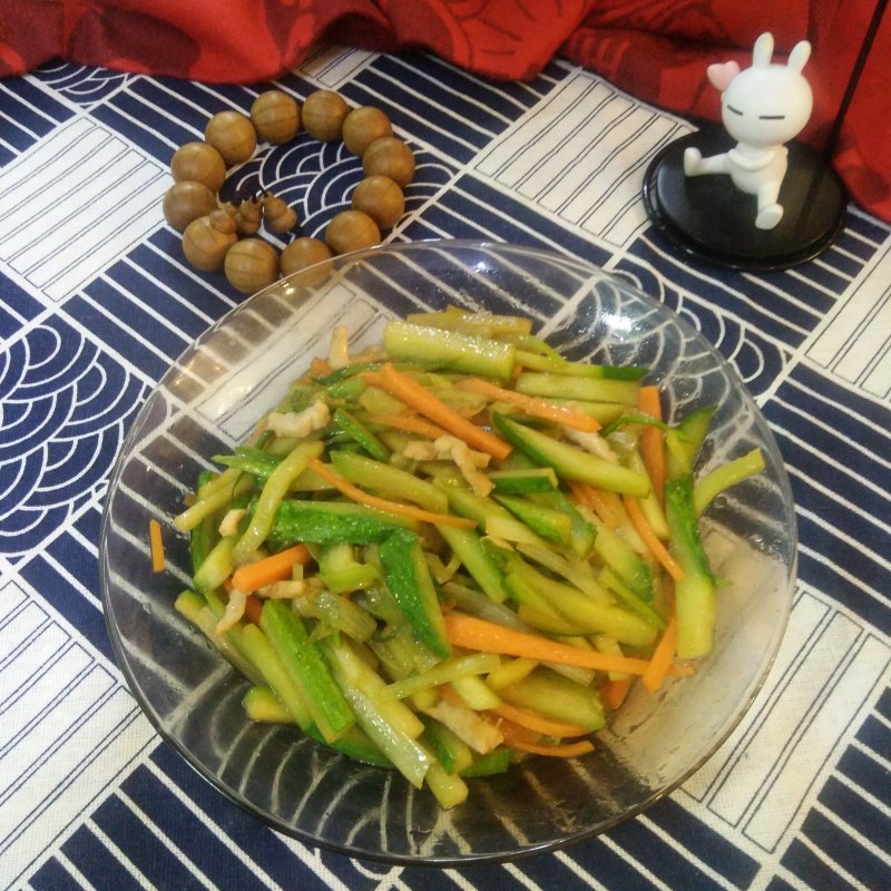 猪里脊适量;黄瓜1根;胡萝卜半根;香菜少许;大葱适量;