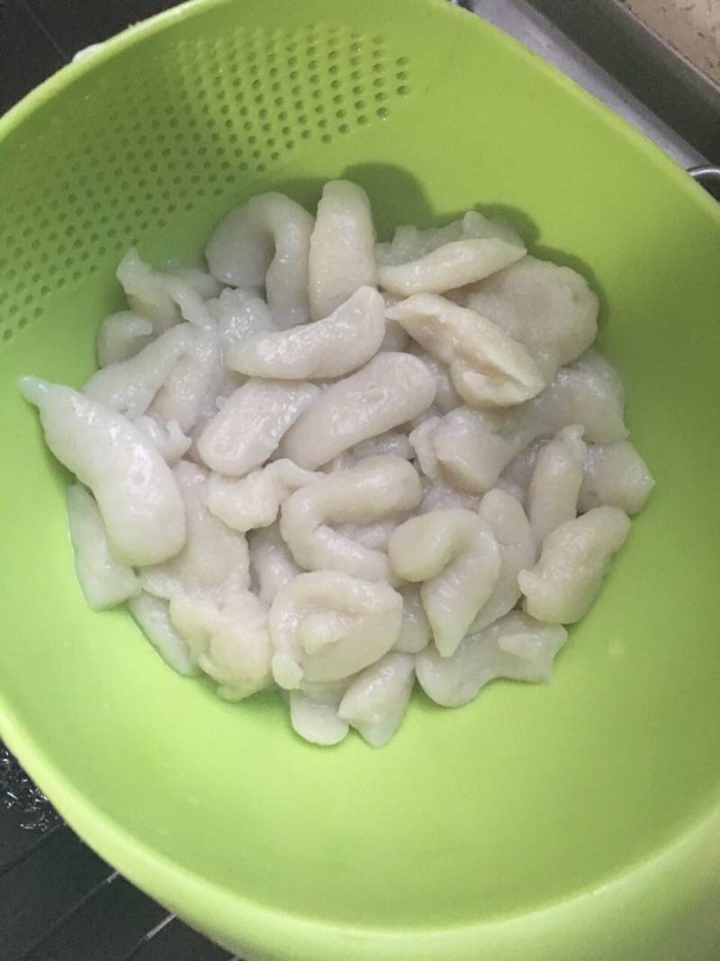 3:水烧到80度左右,用勺子做成小圆形放入锅中,80度左右水容易成圆形,这次搅拌俺水加多了