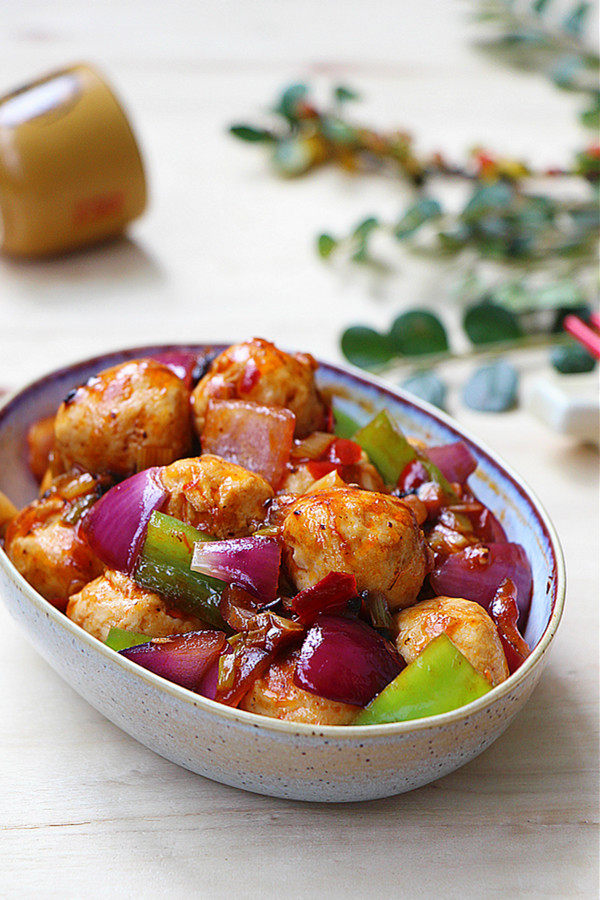 鸡肉丸250克;洋葱1个;白糖2茶匙;豆豉1茶匙;生抽1茶匙;