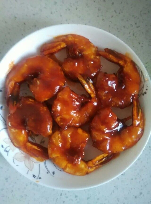 1:食材:鲜虾、白糖、料酒、姜、番茄酱、生抽