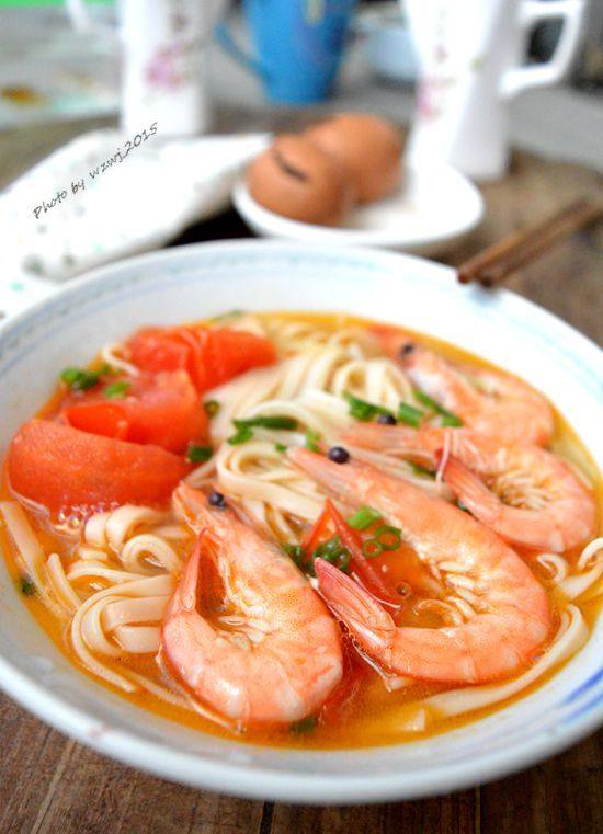 番茄适量;虾仁适量;面条适量;