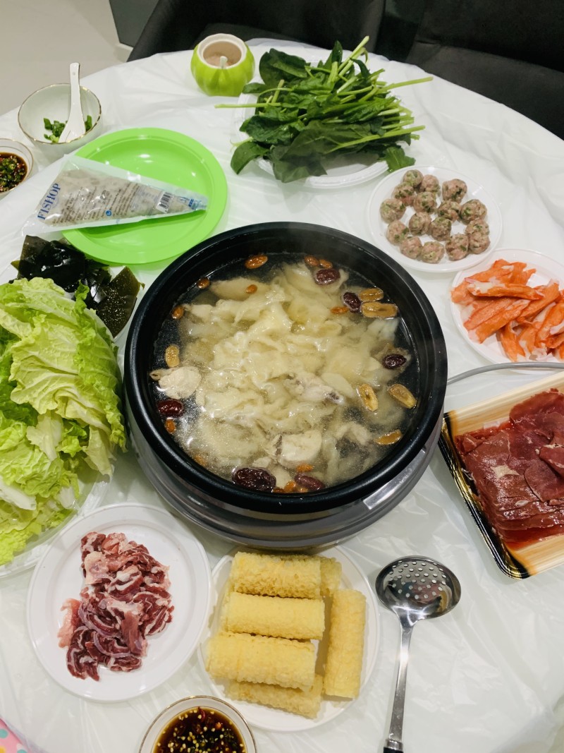 海带适量;红枣适量;白菜适量;蟹肉适量;千张适量;牛肉片适量;自制香菜肉丸适量;枸杞适量;辣椒适量;