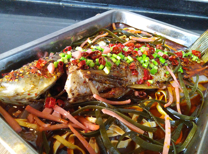 5:1个小时后,烤盘刷油;鱼刷油,加海椒面,花椒面。上下管同时加热,200度,烤8分钟