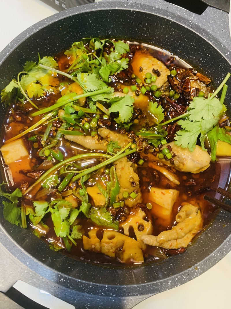 鸡翅4-5个;蒜苔丁适量;土豆适量;莲藕适量;干辣椒适量;火锅料适量;花椒适量;姜片适量;八角适量;香叶适量;