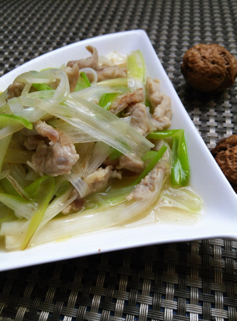 5:炒肉丝,加糖,盐,水,关火放大葱,味精炒匀。