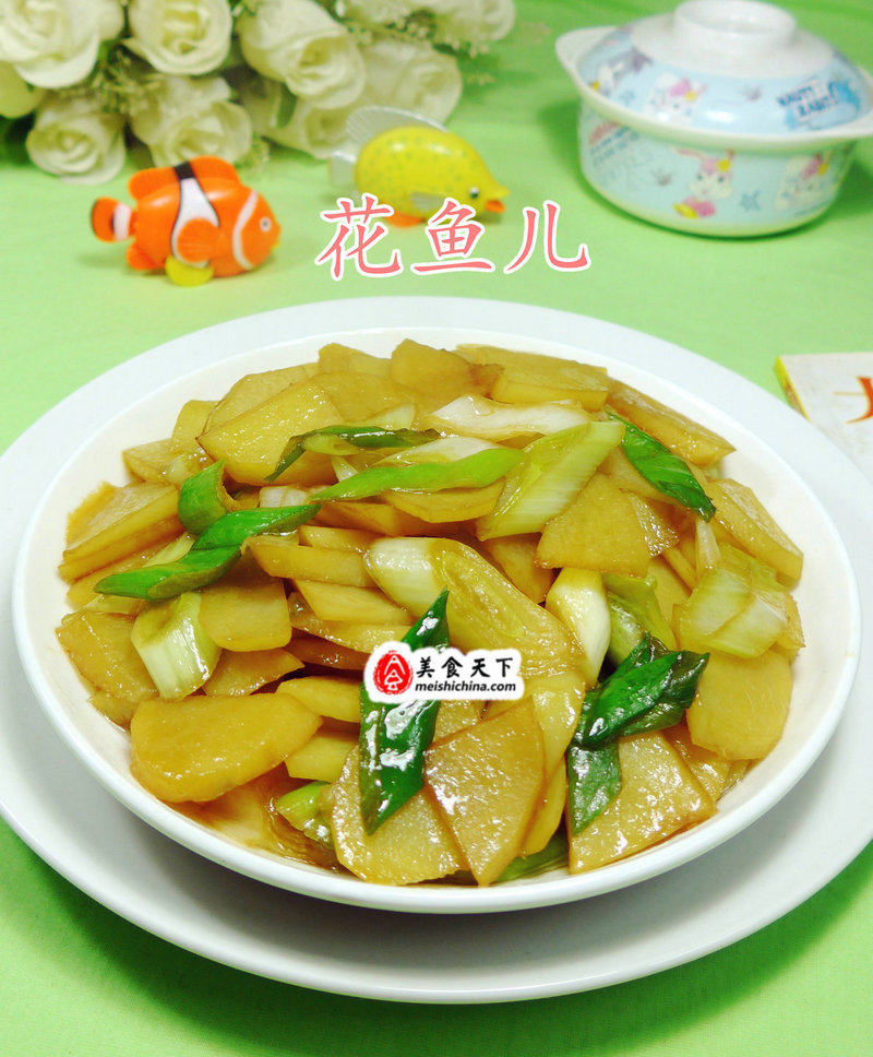 1:土豆洗净、去皮、切片。土豆是黄色的肉。切大葱。