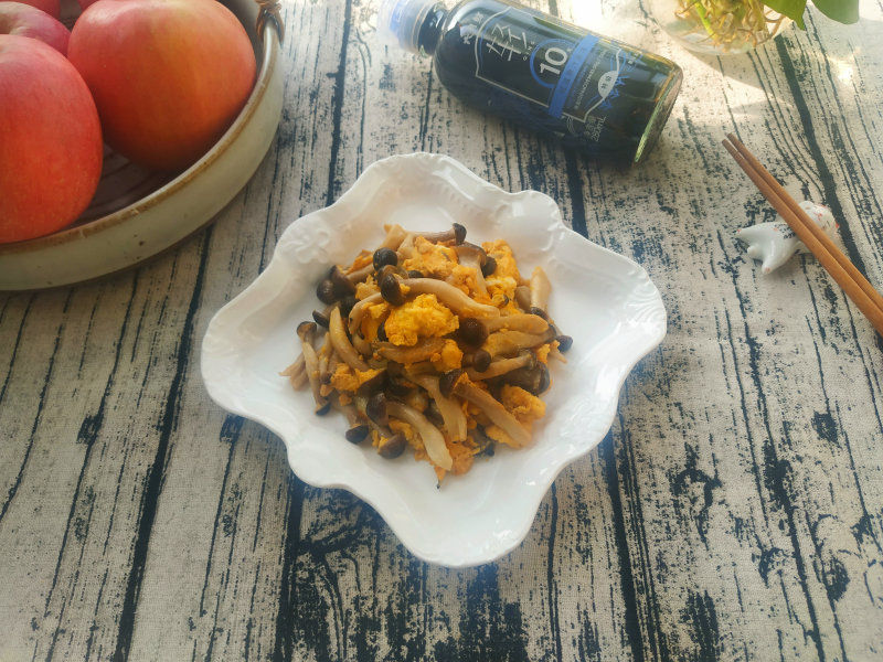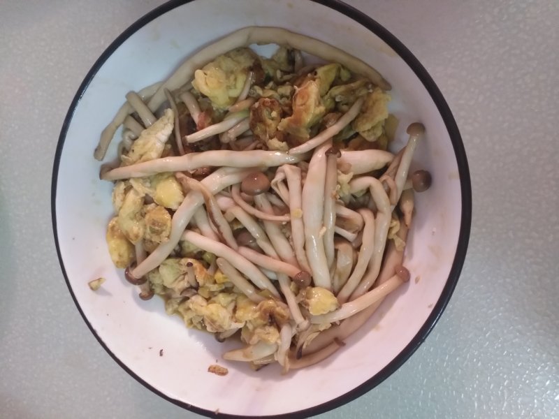 1:准备食材:两个鸡蛋倒入碗中打散,蟹味菇洗净。