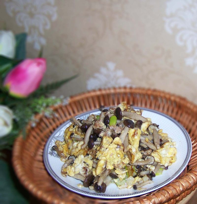 7:等鸡蛋液上面近凝住时,加入葱姜及九成熟的蟹味菇及适量盐