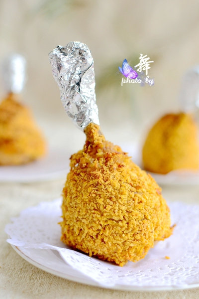 5:腌制好的鸡翅先裹上一层面粉,再沾上鸡蛋液,再裹上面包糠。