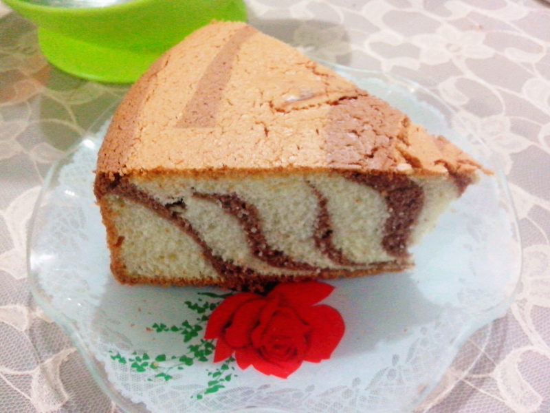 11:烤箱预热150度后,模具以中心为圆点先是一勺白色蛋糕糊叠加一勺可可蛋糕糊,依次类推倒入全部蛋糕
