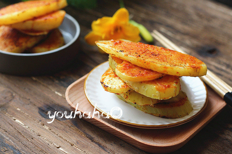 6:提示音响起,开盖,土豆片翻面,刷上调匀的辣椒酱