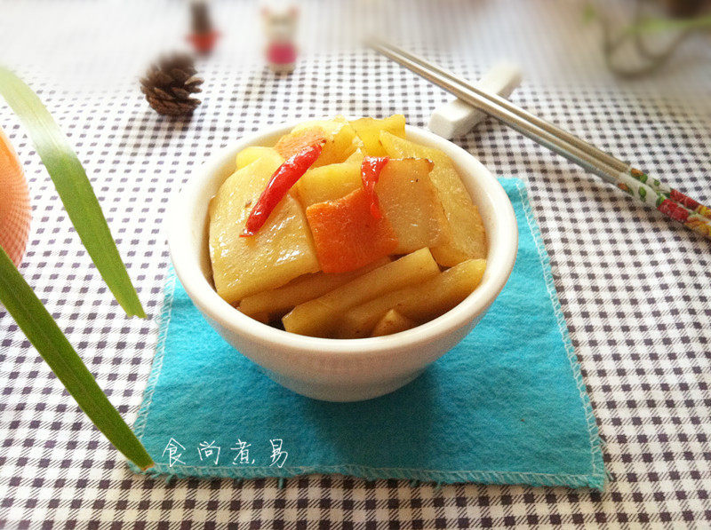 1:食材:土豆、胡萝卜、蒜瓣、小辣椒。