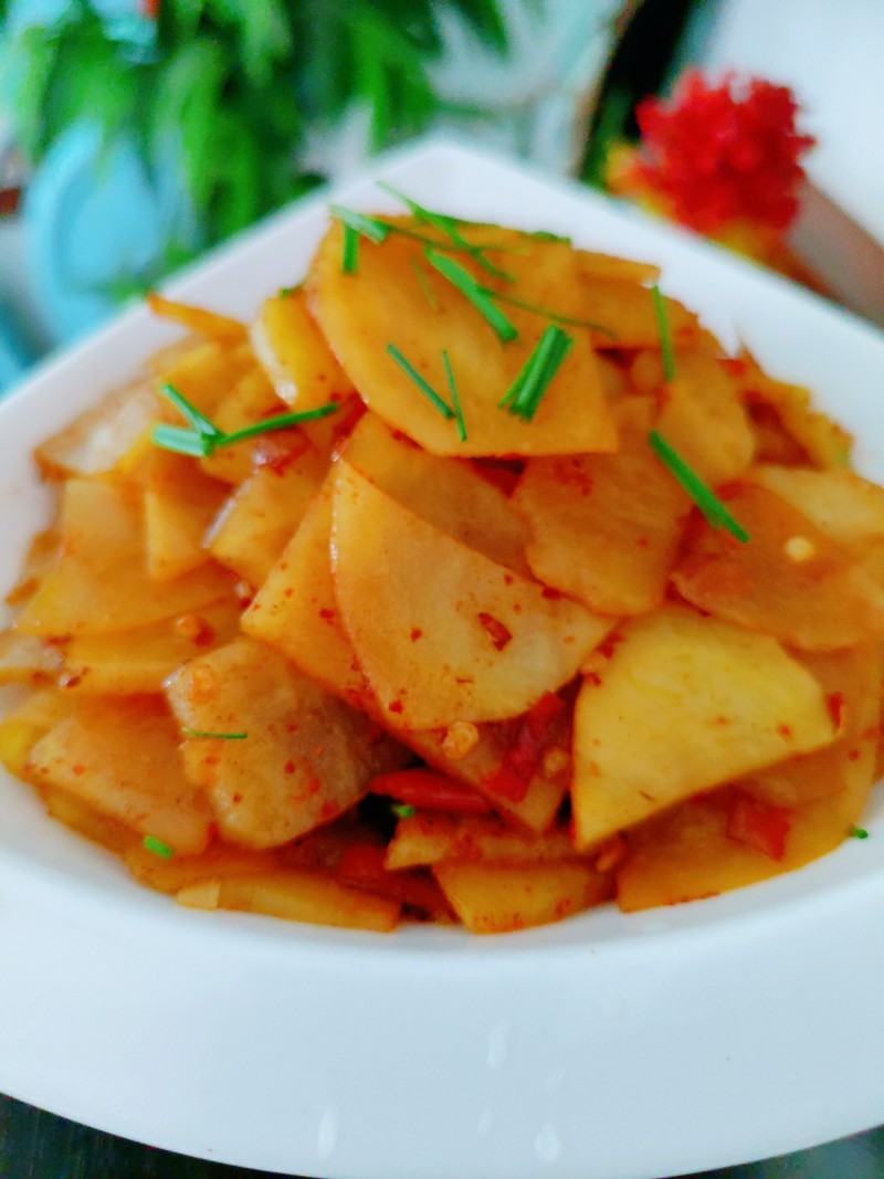 2:把土豆片装盘倒入适量生抽和陈醋最后淋上炒热的辣椒油撒上葱花就可以吃啦