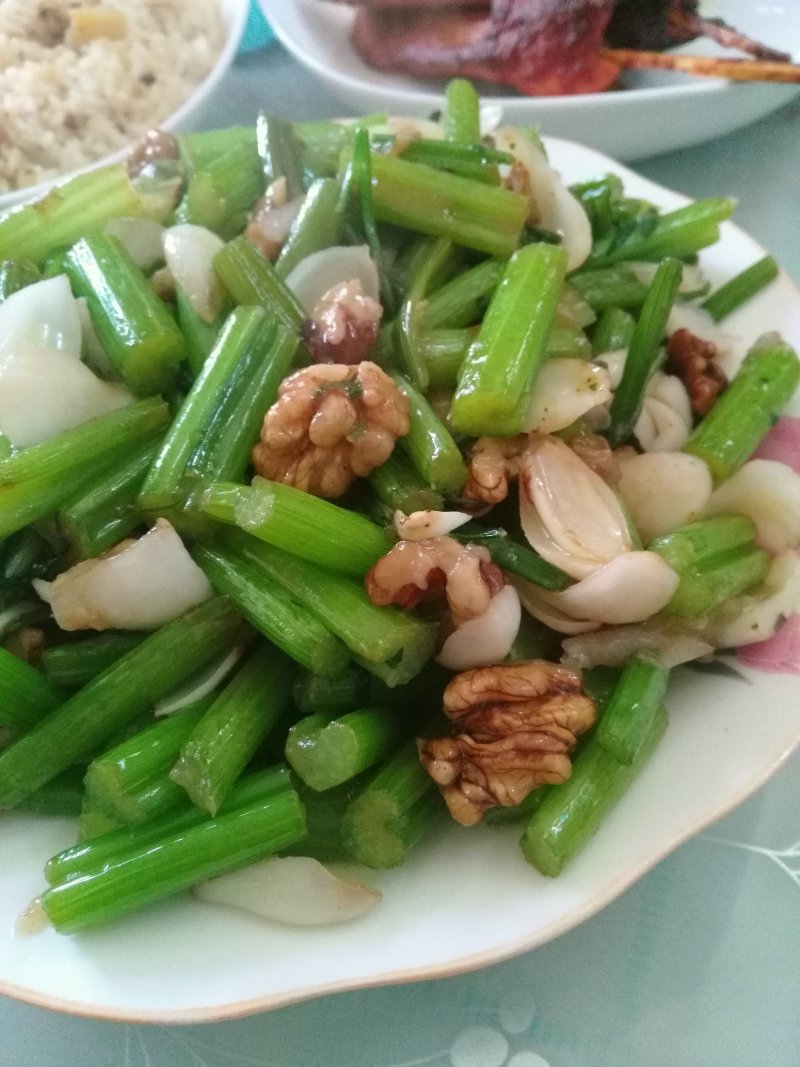3:核桃下锅炸,捞出备用。葱花炒香,加盐加入西芹百合核桃炒熟装盘