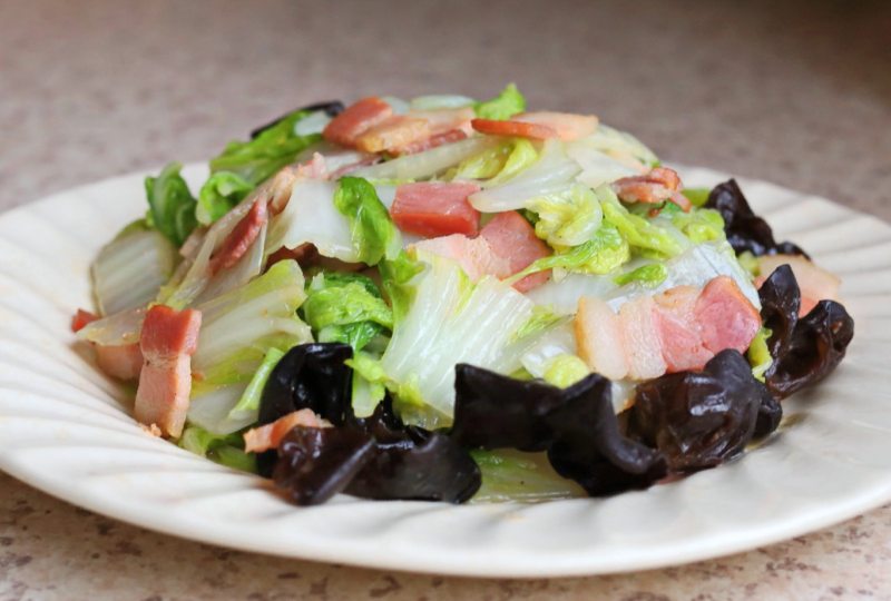 2:黑木耳沥水,放进炒过培根的锅里,加少量开水盖好盖子煮2分钟,直到水分基本上煮干