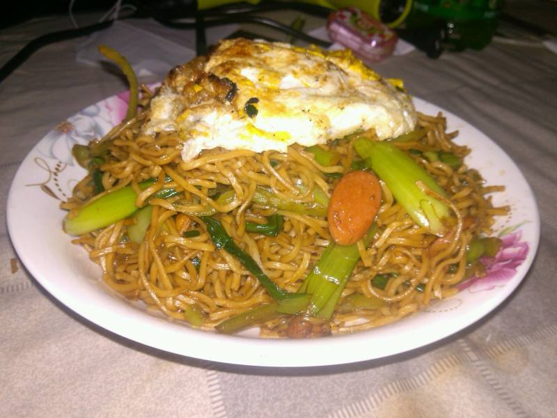 3:出锅入盘子锅洗干净,把准备好的鸡蛋煎熟(加点盐)铺在做好的细面上香喷喷的炒细面就做好了