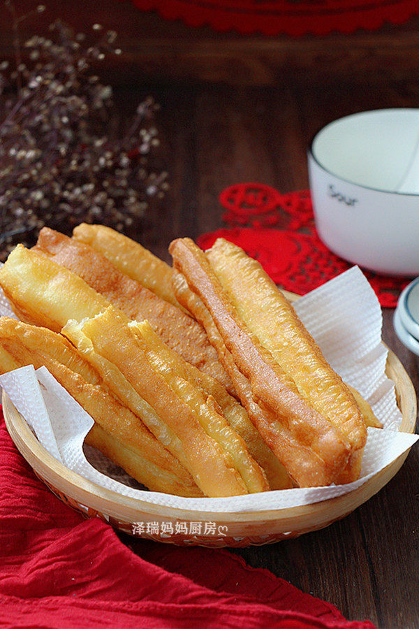 油温一定要控制好,油条都是高筋粉,面团很筋道,下油锅之前长点抻。
