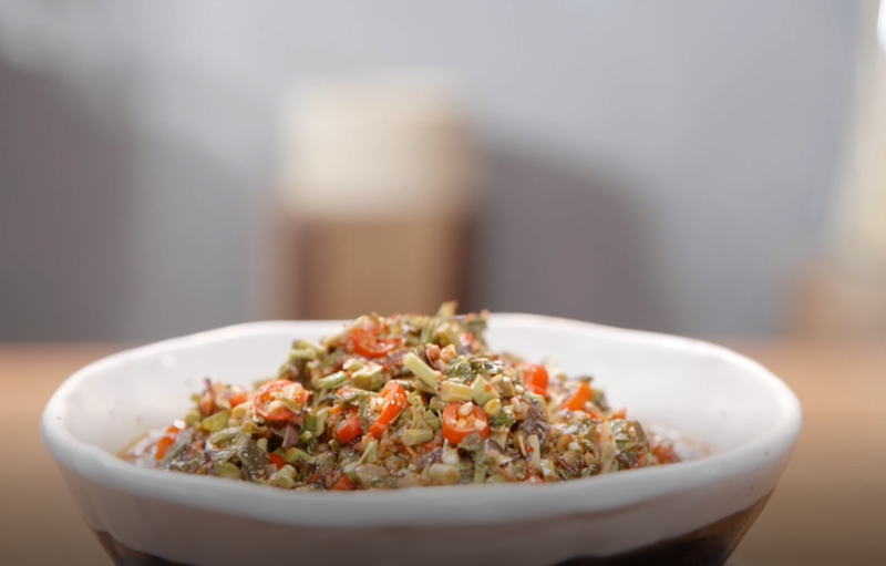 2:香椿叶加半勺盐和1勺香油砸碎。