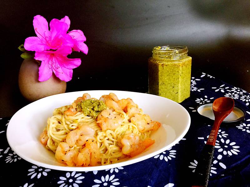 3:坚果碎加入香椿末搅拌成酱,加入少许盐调味,放入品利橄榄油调均。
