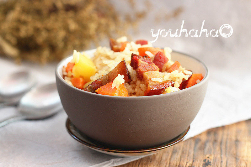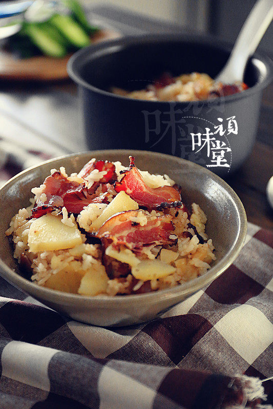 11:饭煮好后再焖个20分钟左右将腊肉土豆与米饭翻匀即可。