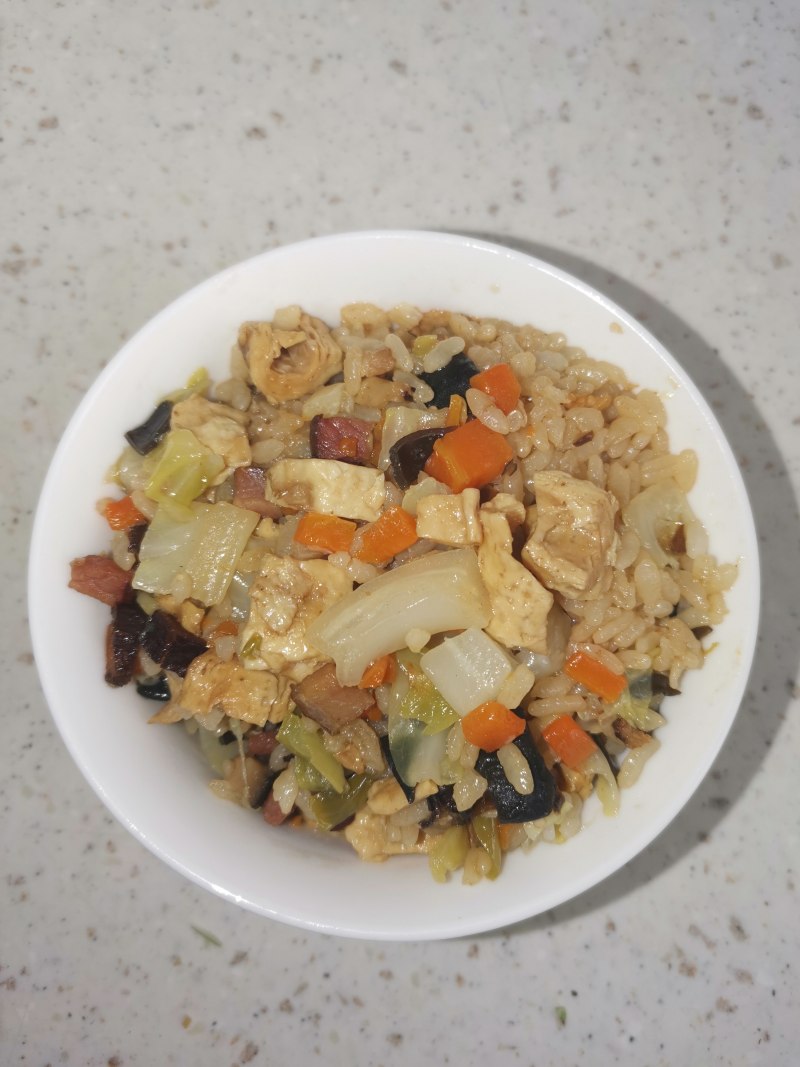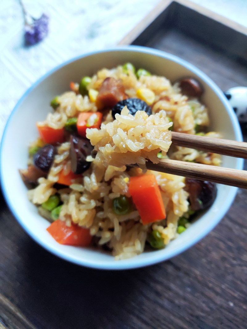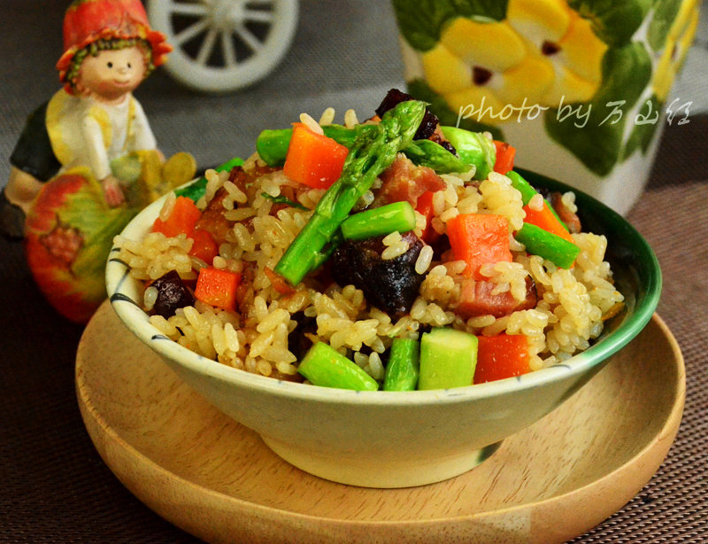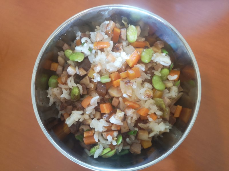 6:稍微爆一下,加入胡萝卜、香菇、青豆翻炒,加入少量生抽、老抽着色(腊肉太咸就不要加盐)。