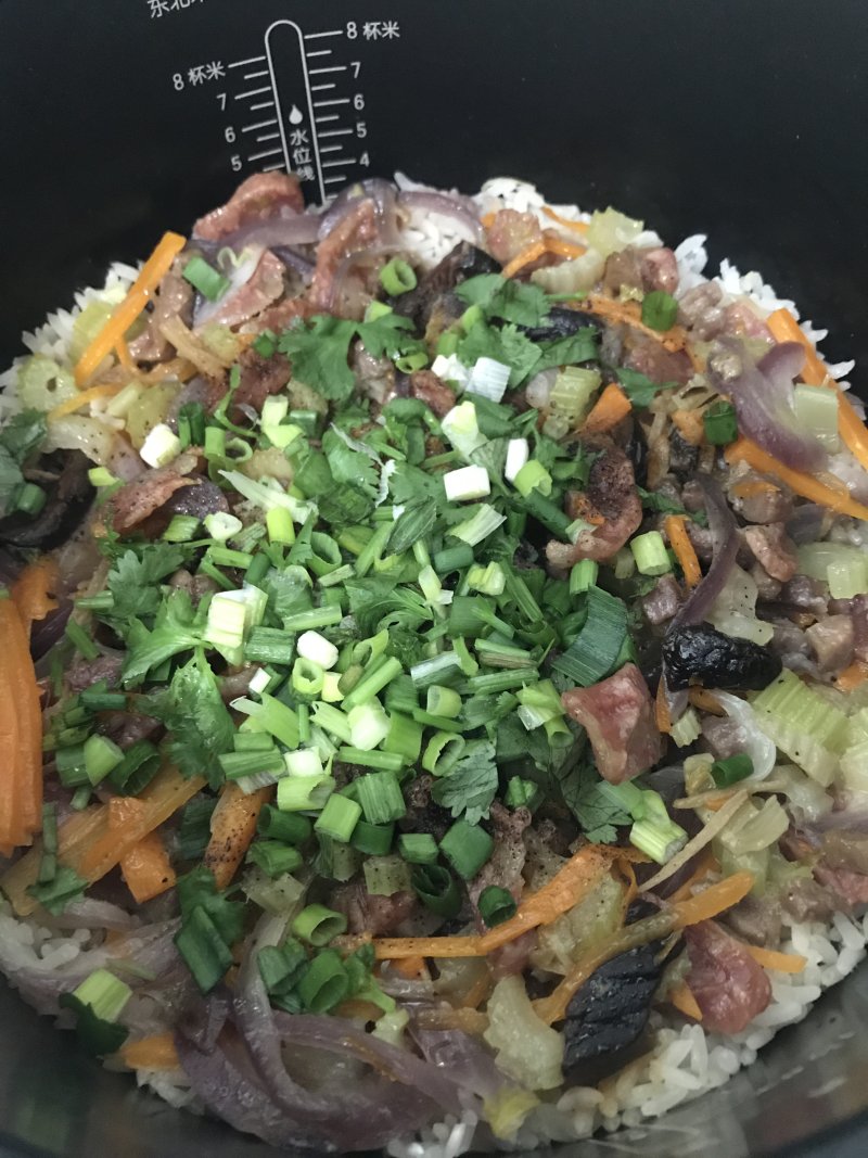 8:大米放入电饭煲,加焖饭的水及炒好的所有食材,加入生抽,料酒,白糖,搅匀。