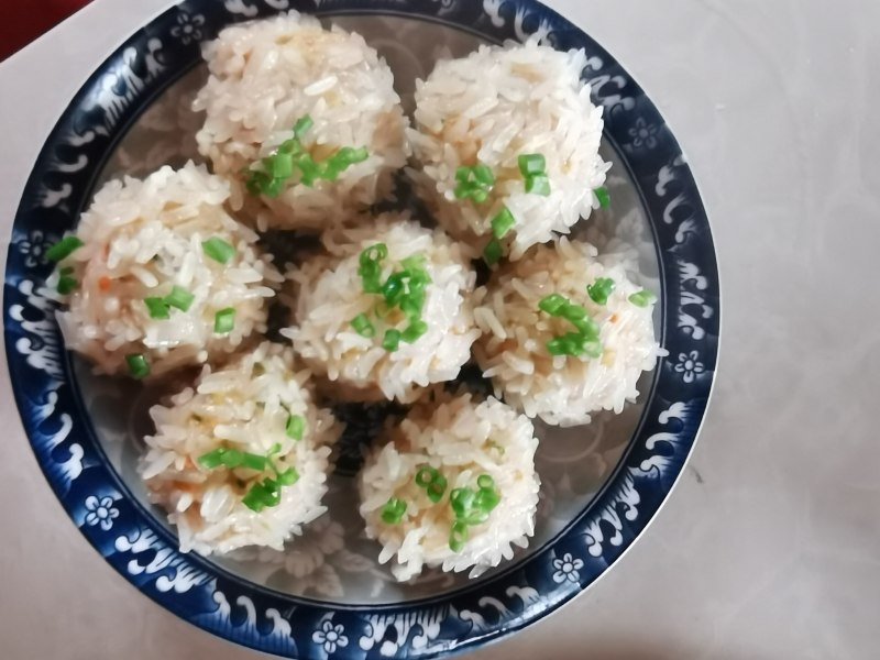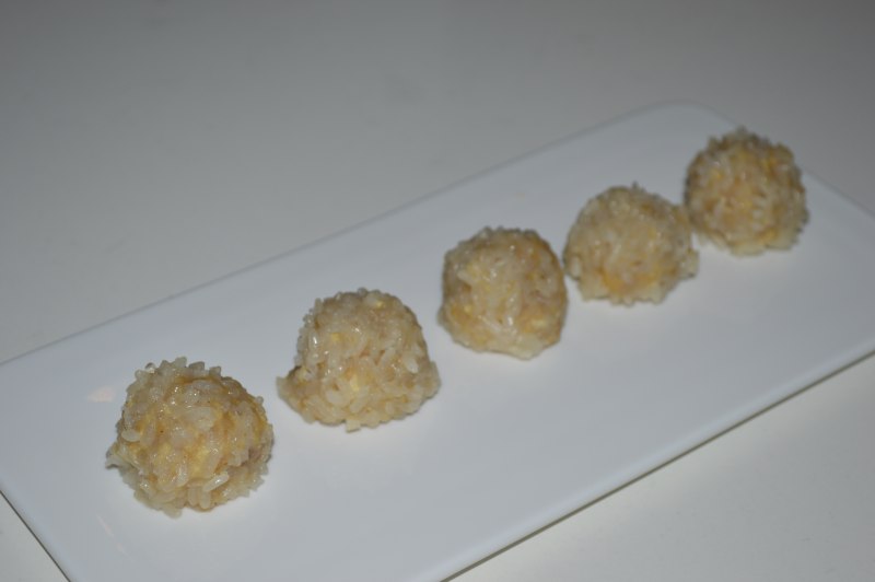 5:把调好的肉攒成一个丸子,然后放在糯米上滚一圈(糯米必须提前用水泡好至少5个小时),放在蒸锅上蒸至30分钟