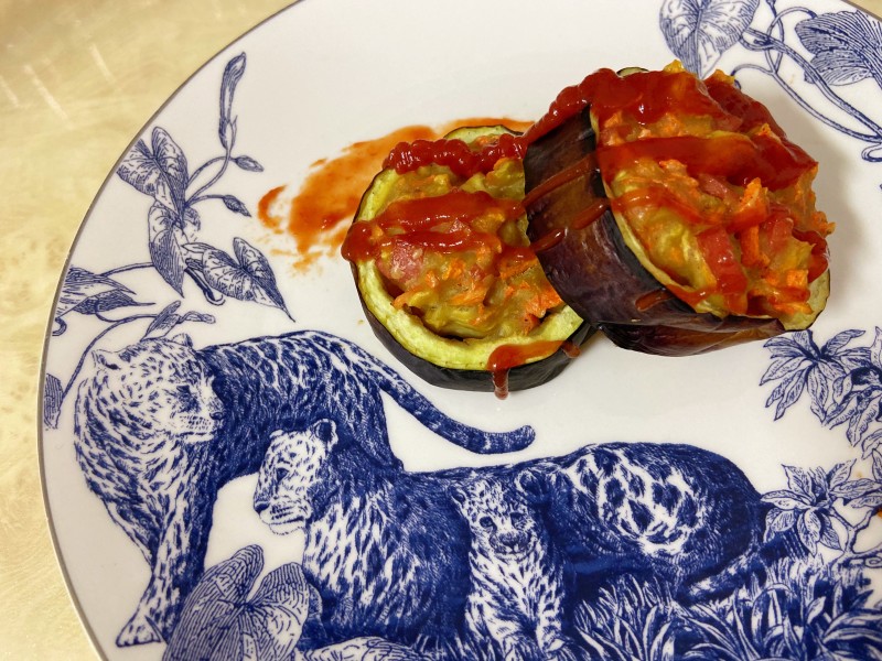 10:把馅料塞进茄子。做成在切包子。
